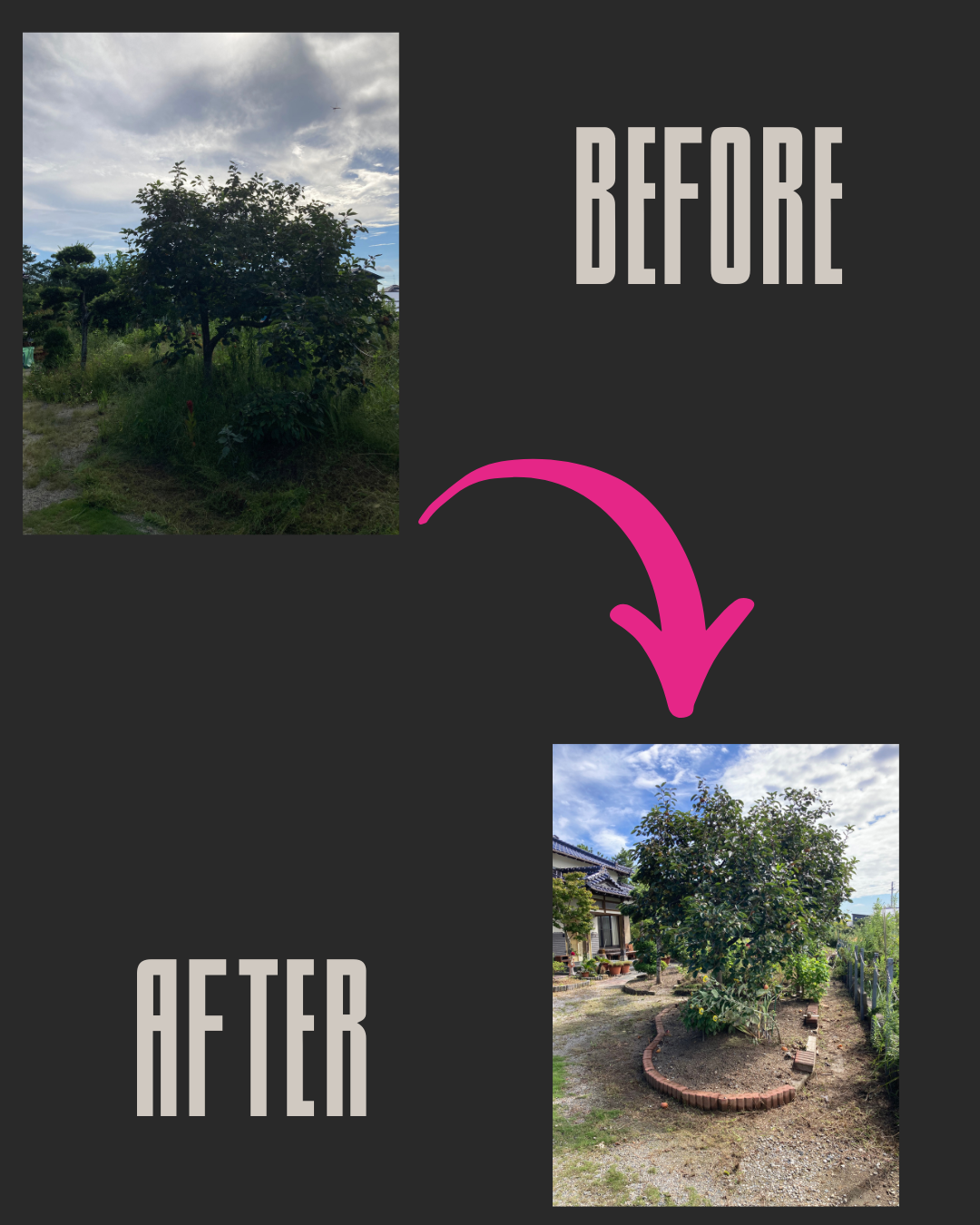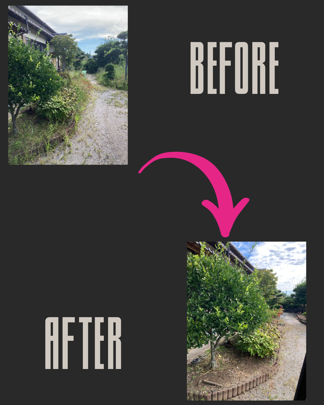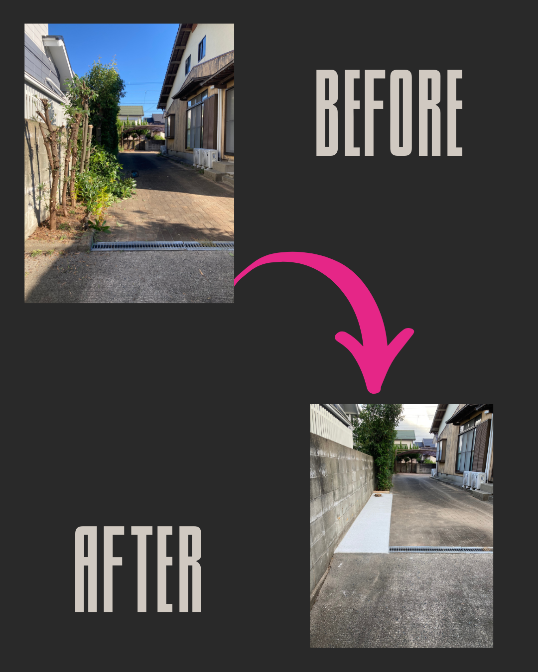 花壇の一部を取り壊し、そこに車が通れるようにしてほしいとのご依頼を承り、庭木の伐採、伐根、土間打ちをさせて頂きました。ありがとうございました。