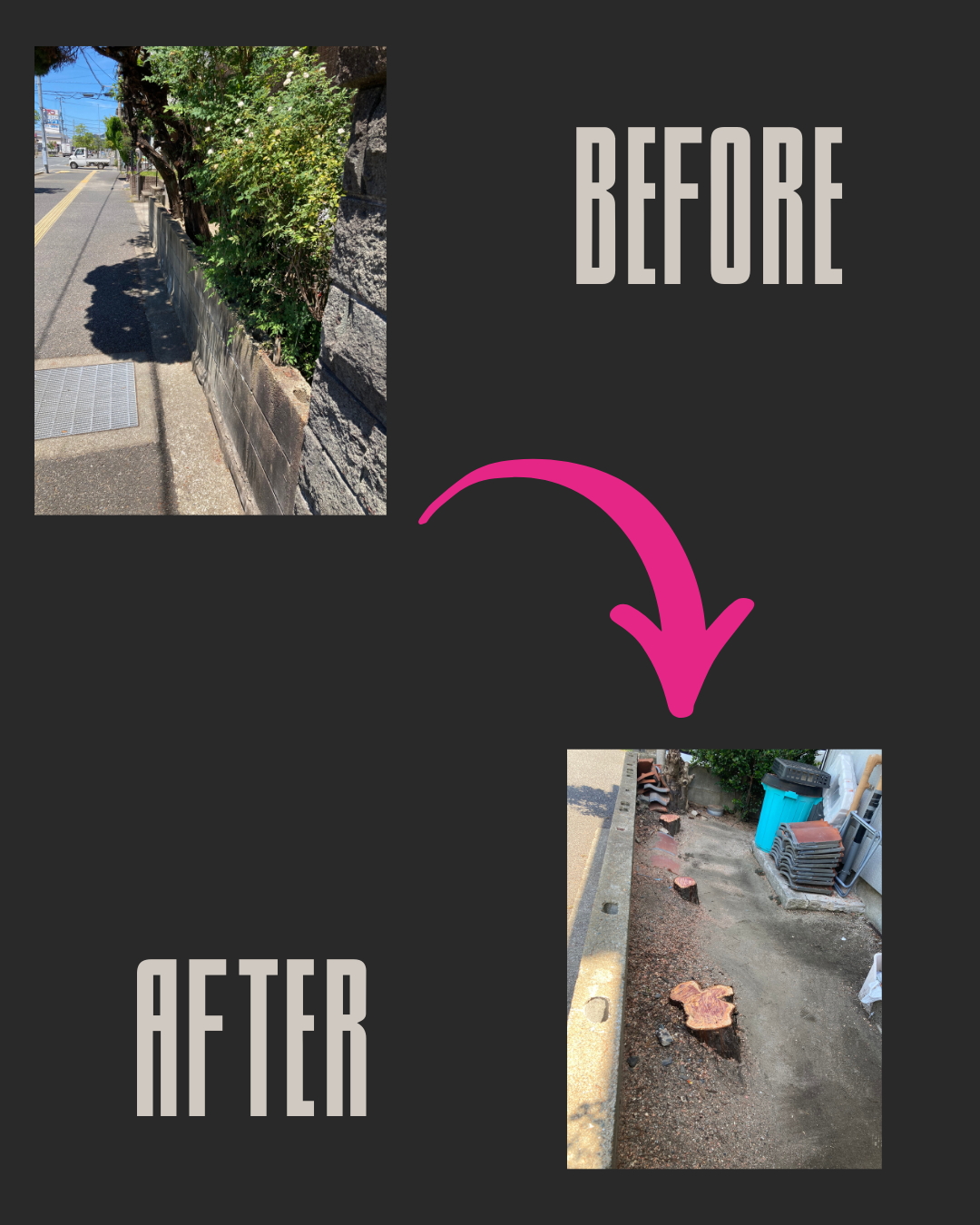 ブロック塀にフェンスを取り付ける為に、邪魔になる庭木の伐採作業をさせて頂き、木くずもしっかりと除去させて頂きました。この後、フェンスの設置をさせて頂きます。