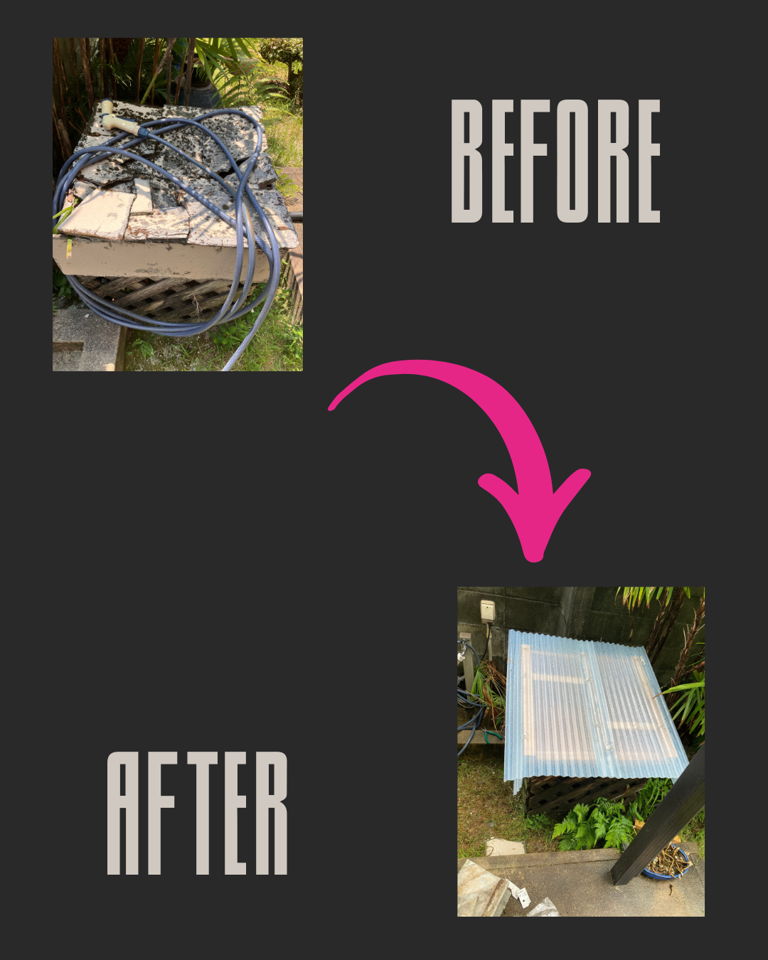 屋外に設置された物置の既存の屋根が壊れていたので、雨にも耐えられるものを作成させていただきました。