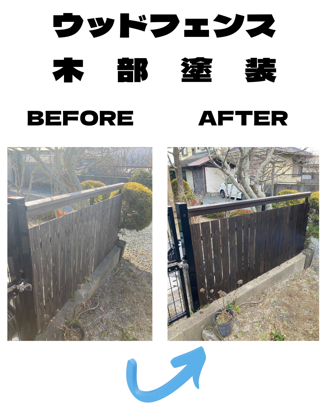 ウッドフェンスの木部塗装のご依頼です。雨、風、紫外線等に影響により定期的にメンテナンスをしないといけません。塗って乾いて、二度塗りをしています。木目が奇麗になると新しくなったようで見栄えがいいですね。