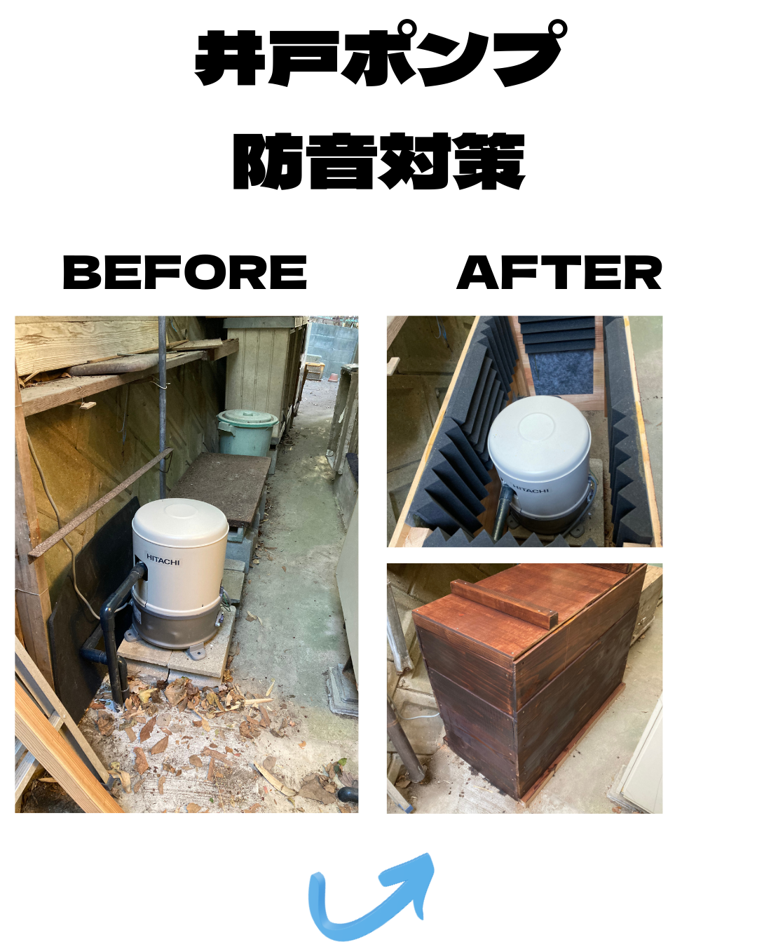 井戸水を吸い上げるときに発生する音の影響で、隣接する家の住人に気を使いながら水(ポンプ)を使用する生活をされておられる依頼主様のご依頼で、井戸ポンプの防音対策をさせて頂きました。木材で囲いを作成し、内側に遮音シート、吸音材を貼り付ける防音対策になります。木材も長持ちするよう木部塗装(防虫、防腐)を施しました。
